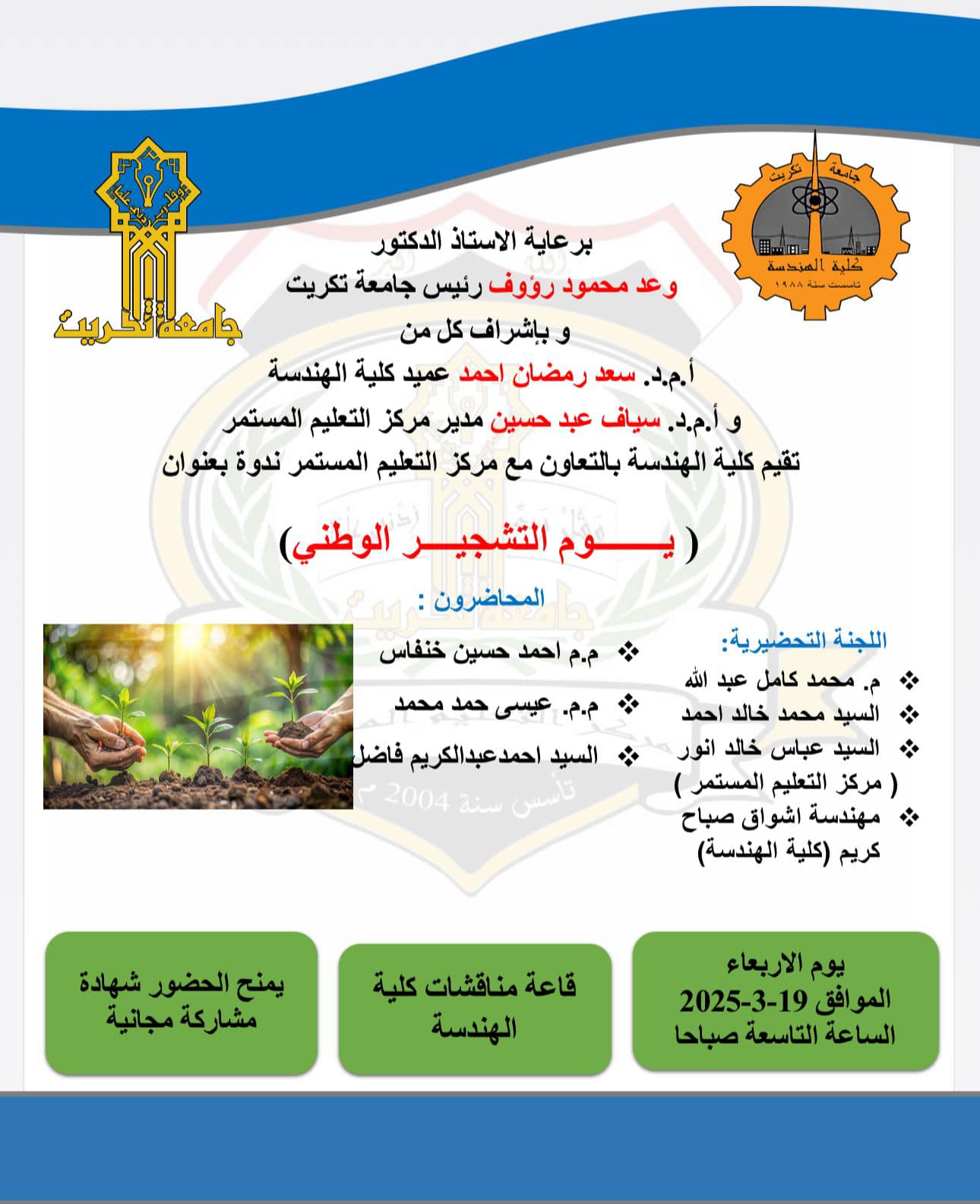 تأسست كلية الهندسة - جامعة تكريت عام1988 على اساس هدف سامي وواضح وهو إعداد وتخريج نخبة من المهندسين في الاختصاصات الهندسية المختلفة ليحملوا على اكتافهم خدمة المجتمع وبناء الوطن في هذه الاختصاصات. هذا بالاضافة الى دورها في دعم التدريسيين وتطوير امكانياتهم العلمية وذلك بأجراء البحوث العلمية والمساهمة بشكل او بآخر في الاستشارة والتصميم والاشراف والمتابعة لمشاريع الدولة والمجتمع وخدمة الصالح العام. بدأت كلية الهندسة بثلاث اقسام هي الهندسة الكيمياوية، الهندسة الميكانيكية، الهندسة المدنية والتي تأسست عام 1989. اما قسم الهندسة الكهربائية فقد تأسس عام 1993 وقسم هندسة البيئة فقد تأسس عام 2006 .تبلغ مساحة الكلية (131434) م2 .ومساحة الارض المقامة عليها الكلية بكل منشآتها (11050) م2 . وان نسبة الساحات الخضراء من مساحة الارض الكلية 91%. تقع كلية الهندسة داخل جامعة تكريت والتي تقع الى الشمال من مركز محافظة صلاح الدين – قضاء تكريت وعلى ضفاف نهر دجلة وبعيدا عن المناطق المكتظة بالسكان او مصادر الضوضاء مما يهيئ اجواء دراسية ممتازة.